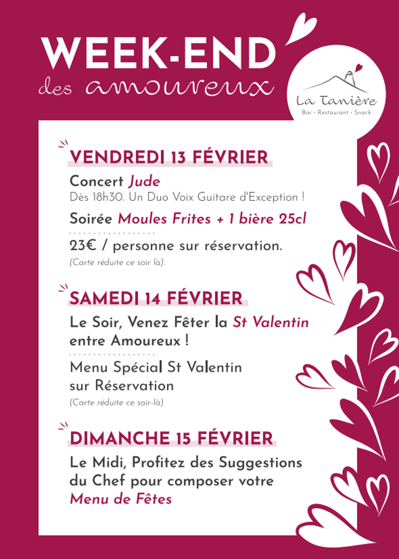 Venez profitez du weekend de la Saint-Valentin à la Tanière !